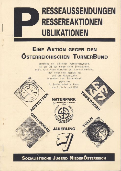 Presseaussendungen, Pressereaktionen, Publikationen betreffend der stilisierten Hakenkreuzsymbole, die der ÖTB von einigen seiner Einrichtungen, selbst nach einem Gutachten des Innenministeriums, noch immer nicht beseitigt hat, und der Aktionswoche "Lebenslust statt Rassenreinheit" gegen das 9. Bundesturnfest in Krems vom 8. bis 14. Juli 1996.