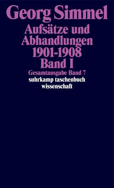 Die im (...) ersten Band der „Aufsätze und Abhandlungen 1901- 1908“ zum Abdruck gebrachten Texte umfassen alle von Georg Simmel namentlich gekennzeichneten deutschsprachigen Aufsätze und Abhandlungen, die erstmals in den Jahren 1901 bis 1905 in Zeitungen, Zeitschriften und Jahrbüchern erschienen sind. (...) Im vorliegenden Band finden sich neben vier soziologischen Abhandlungen, die jedoch so umfänglich sind, daß sie ein Drittel dieses Bandes füllen, elf kunstphilosophische Studien, sechs philosophische, fünf religionswissenschaftliche und drei kulturphilosophische Beiträge.(aus: Edit. Bericht, S. 351 ff.)