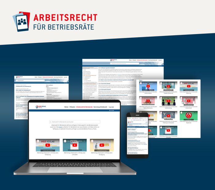 Du kannst dich darauf verlassen: Die Inhalte werden regelmäßig aktualisiert und basieren auf den hochwertigen Ratgebern und Fachbüchern aus dem ÖGB-Verlag. Außerdem hast du Zugriff auf arbeitsrechtliche Skripten des Verbands Österreichischer Gewerkschaftlicher Bildung und Videos aus der Reihe „Arbeitsrecht in 90 Sekunden“.