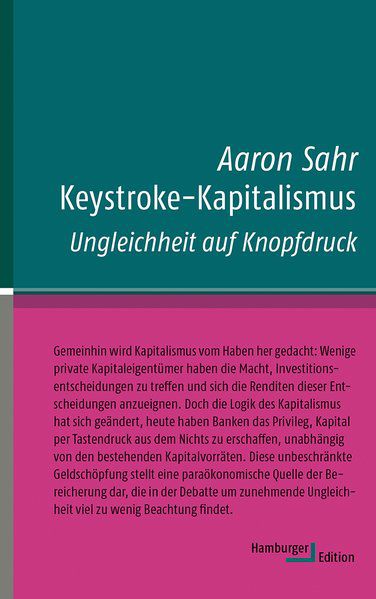 Aaron Sahr beleuchtet das Dreieck von Privatvermögen, Schulden und ökonomischer Ungleichheit und stößt dabei im »Maschinenraum des Kapitalismus« auf eine paraökonomische Quelle der Vermögensbildung: das Geldschöpfungsprivileg privater Banken. Private Banken produzieren heute Geld aus dem Nichts durch einfachen Tastendruck. Von diesem außergewöhnlichen Privileg, so die These Sahrs, profitiert vor allem eine Minderheit, ist sie doch in der Lage, sich die Renditen des Tastendruck-Systems anzueignen. Es gilt zu verstehen, durch welche Kanäle diese Aneignung gelingt, was sie für unser Verständnis des Kapitalismus bedeutet und wie mit ihr umzugehen ist.