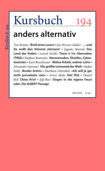 Alternativen zwingen uns, Gründe zu finden, für das, was ohnehin gilt. Und Alternativen ermöglichen es, auf die Gestaltbarkeit der Welt hinzuweisen. Beide Aspekte werden in Kursbuch 194 auf verschiedenen Feldern diskutiert: Politik und Kultur, Wirtschaft und Lebensführung, Medien und Technik.