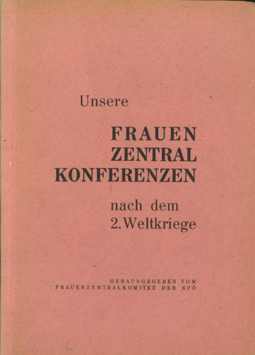 Ausführliche Dokumentation der ersten Funktionärinnenkonferenz vom 25. bis 26. Oktober 1945 und der Frauenzentralkonferenz der Sozialistischen Frauenorganisation Österreichs vom 18. bis 19. November 1946 unter dem Motto Wir festigen den Weltfrieden!.